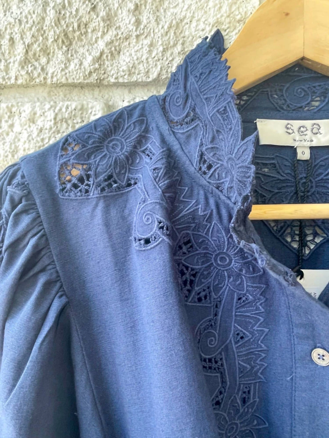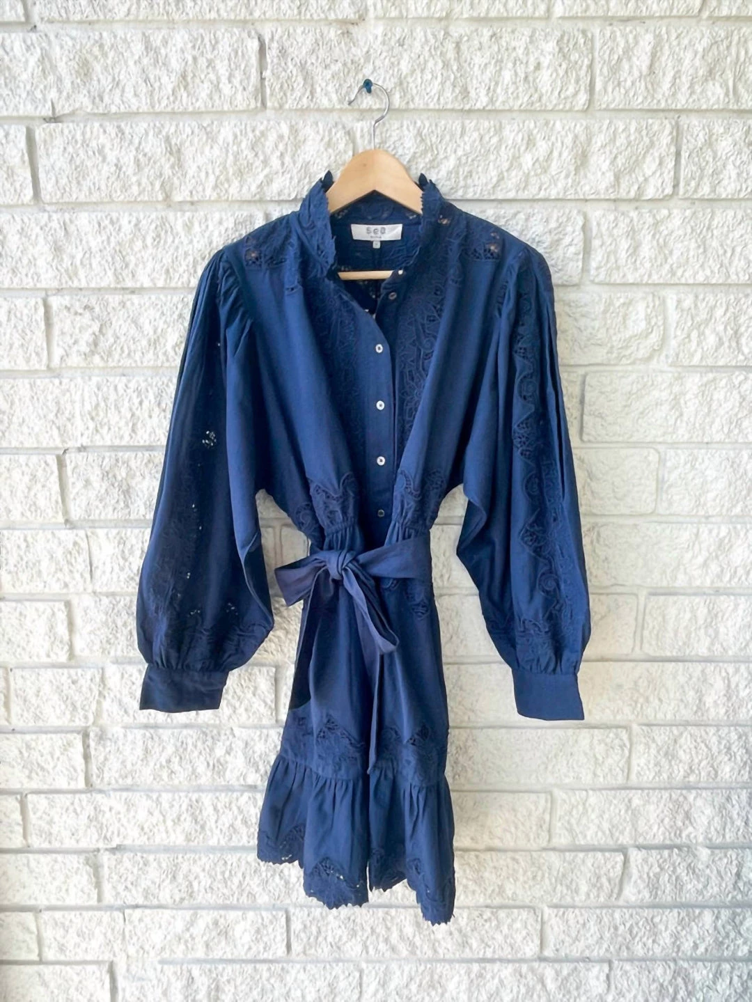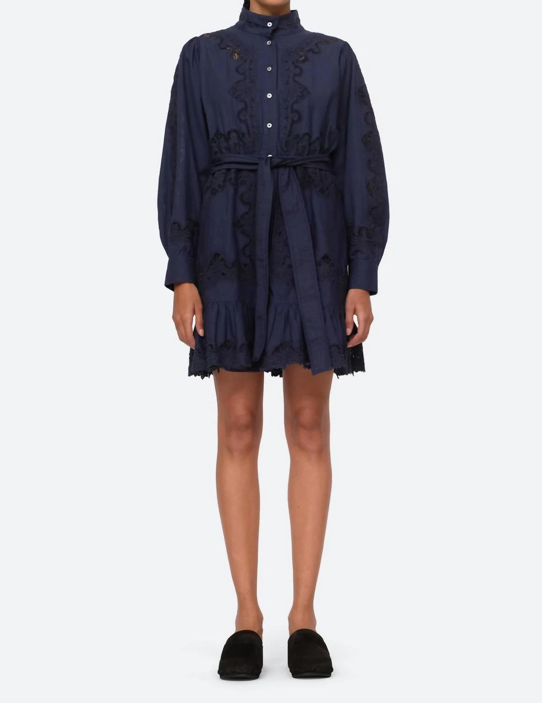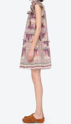 Button down dress with the buttons going down the length of the center bodice.��The neck has mock neck collar that has a slight ruffle detail. The dress ties at the waist to add shape to the relaxed bodice and the hemline of the dress has a ruffle flair. Dry clean