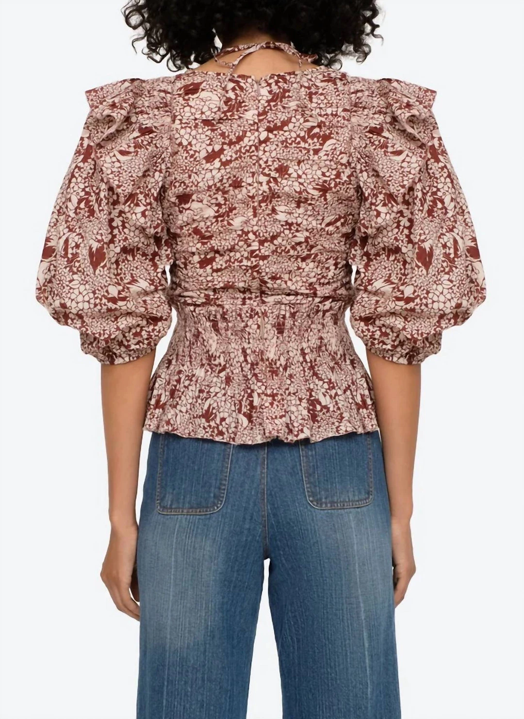 Features puff sleeves, ruched bodice, halter neck tie, ruffle detailing and cutout accent.