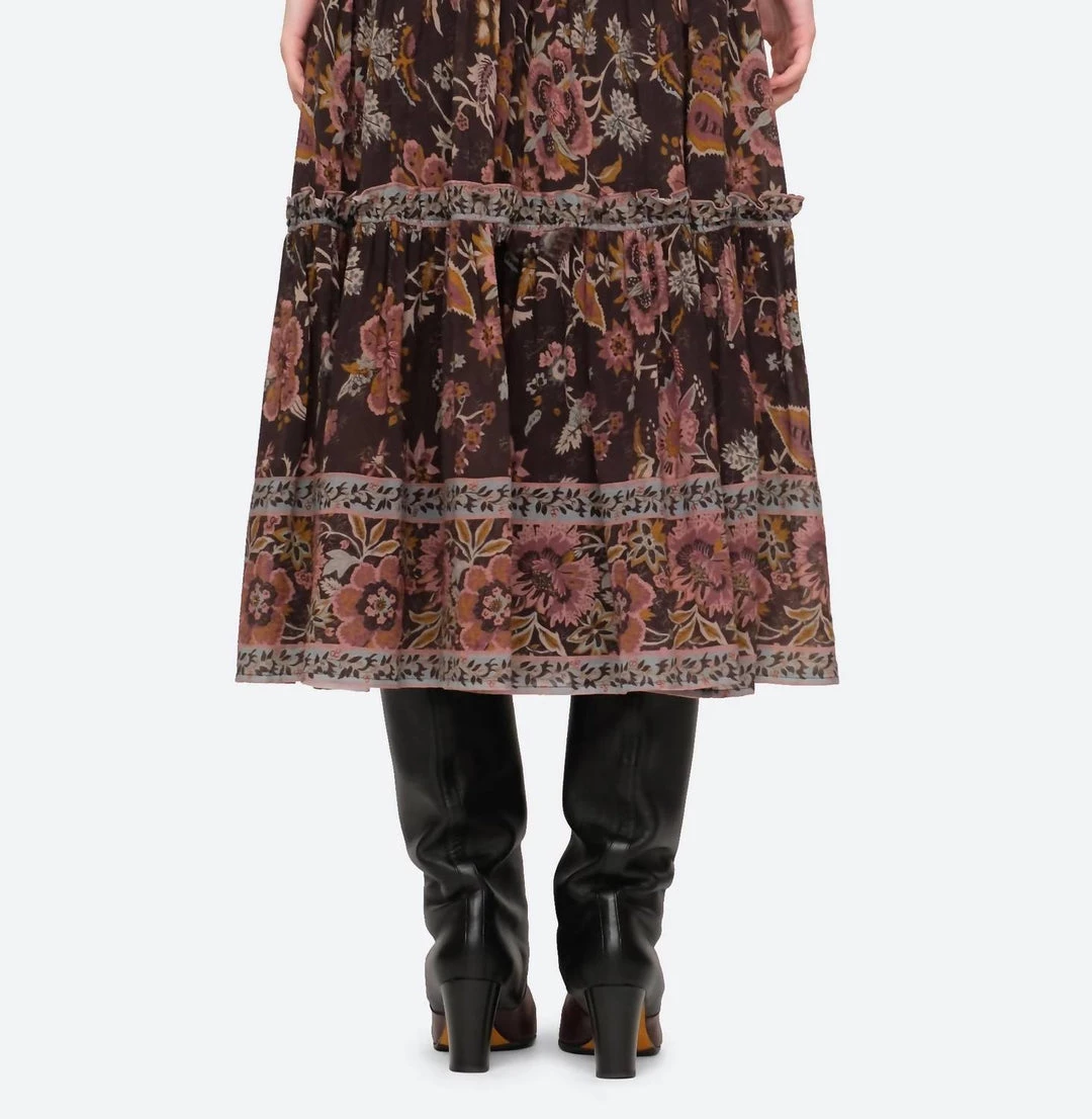 The Tess floral print tiered midi skirt features an elasticized waist and ruffle detailing.slip on